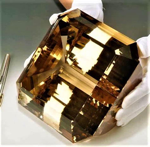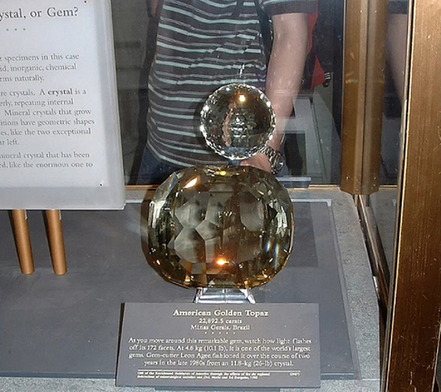 «Американский золотой топаз» [The American Golden Topaz], который хранится в Национальном музее естественной истории (Смитсоновский институт) в Вашингтоне, является третьим по величине ограненным драгоценным камнем в мире. Его вес 22 892,5 карата – это 10,09 фунта (4,5785 кг). «Американский золотой топаз» получен из необработанного камня весом 26 фунтов (11,79 кг).