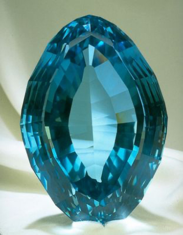 Этот голубой топаз в форме футбольного мяча (регби) из штата Минас-Жерайс, Бразилия, весит 7033 карата. Без имени. Хранится в Смитсоновском институте, Вашингтон. Как и большинство голубых топазов, он приобрел свой стабильный цвет в результате облучения и термической обработки; изначально этот топаз, вероятно, был бесцветным или очень бледно-желто-коричневым. Подарок от компании EDUSCO Investments Co. в 1981 г.