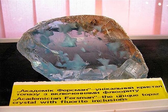 «Академик Ферсман» (весом 2,107 кг или 2110 г) – знаменитость, внесенная в учебники по минералогии многих стран. Название дано в честь популяризатора геологии, минералогии и геохимии академика Александра Евгеньевича Ферсмана (1883-1945). Это прозрачный, пронизанный удивительным голубым внутренним свечением камень. Это знаменитейший из волынских пейзажных топазов. Размер камня 14 х 8 х 8 см. Это фрагмент более крупного кристалла (поперечный выкол по спайности).