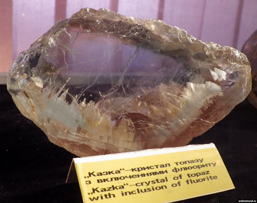 Самый крупный кристалл топаза, который был добыт в 1964 г. на Волыни, весил 117 кг. Высота кристалла – 82 см. Центральная его часть вино-желтого цвета, а периферийная – розово-желтого. Головка кристалла вполне прозрачна, а основа непрозрачная за счет большого количества трещин и газово-жидких включений. Объем ювелирного сырья из этого кристалла составил 48 кг. Из той же полости было извлечено еще два кристалла массой по 100 кг.