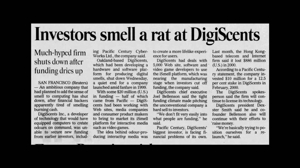 Но к тому моменту случился «крах доткомов»: большинство интернет-компаний столкнулось, мягко говоря, с серьёзными проблемами в поиске финансирования. Digiscent не избежала той же участи. В Toronto Star даже вышла статья с ироничным заголовком: «Инвесторы почуяли неладное в DigiScents».