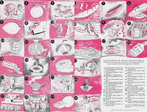 К показу фильма прилагалась соответствующая брошюра с порядкомпоявления запахов. Например, чеснока, краски, обувного крема, хлеба и кофе